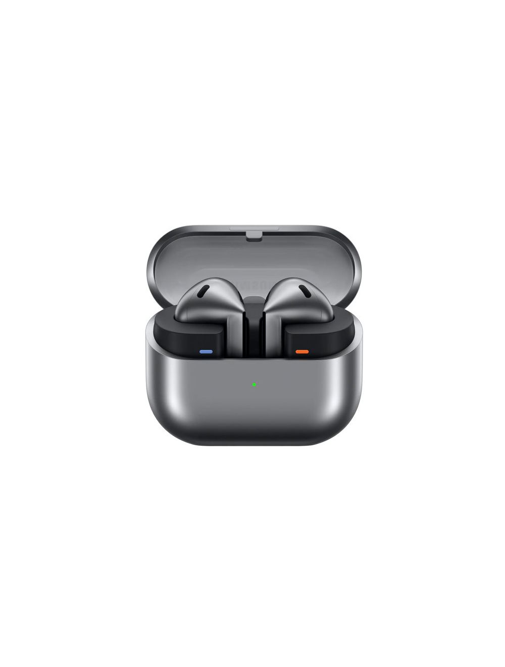 A pair of silver colored Galaxy Buds3 earbuds in a closed case.